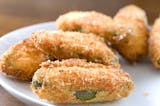 Juicy jalapeno poppers breaded and filled with cheese and fried to golden perfection.